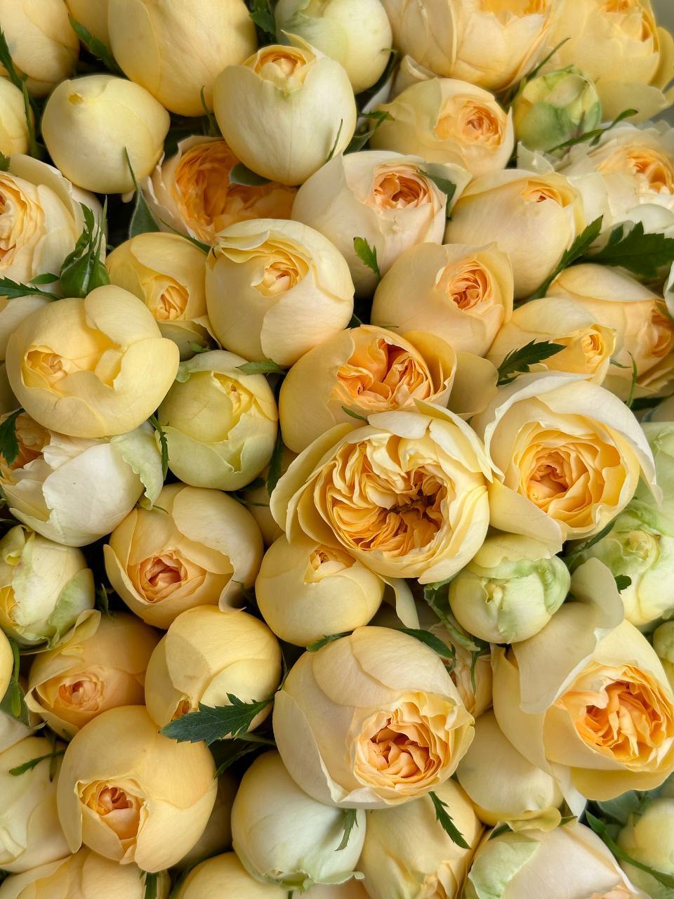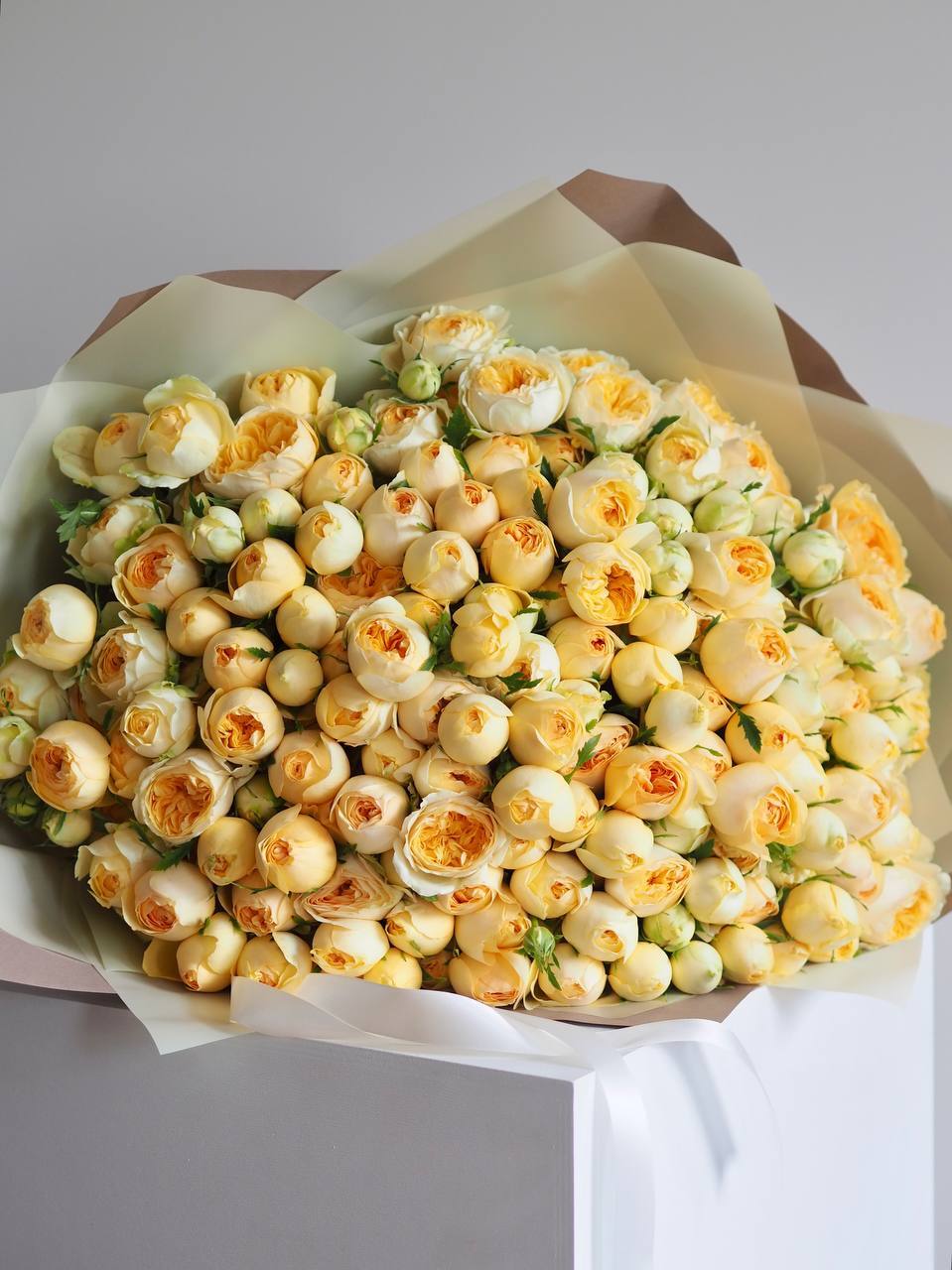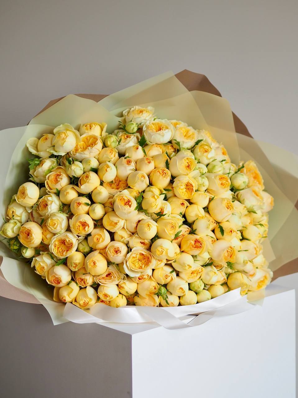 На фото - букет из 29 кустовых роз. Вы можете выбрать цвет внешней упаковки букета и увеличить количество цветов.