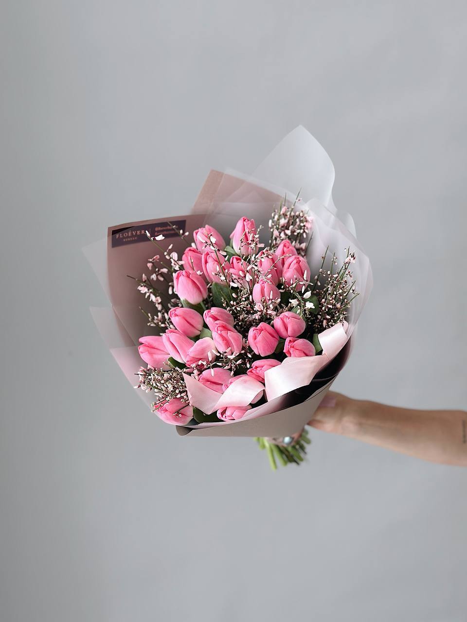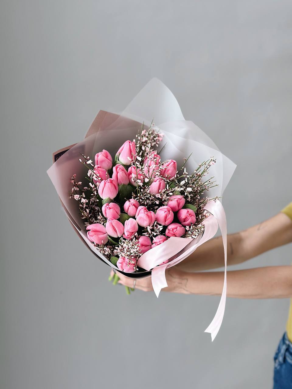 Тюльпаны темно-розовые с генистой в букете M